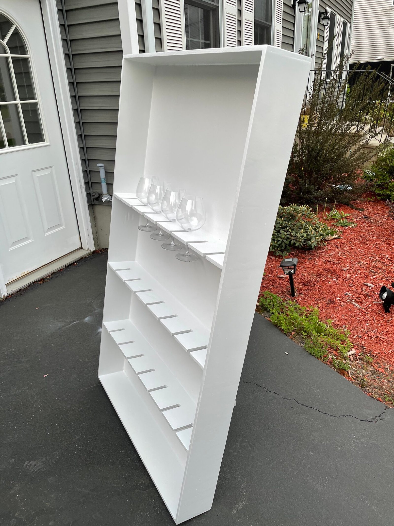 The Boxed Martini Wall with Shelves is a stylish and functional display designed to elegantly hold martini glasses and flutes for events and celebrations. With its modern boxed structure and neatly arranged shelves, this display wall creates a beautiful presentation while keeping glassware organized and easily accessible
