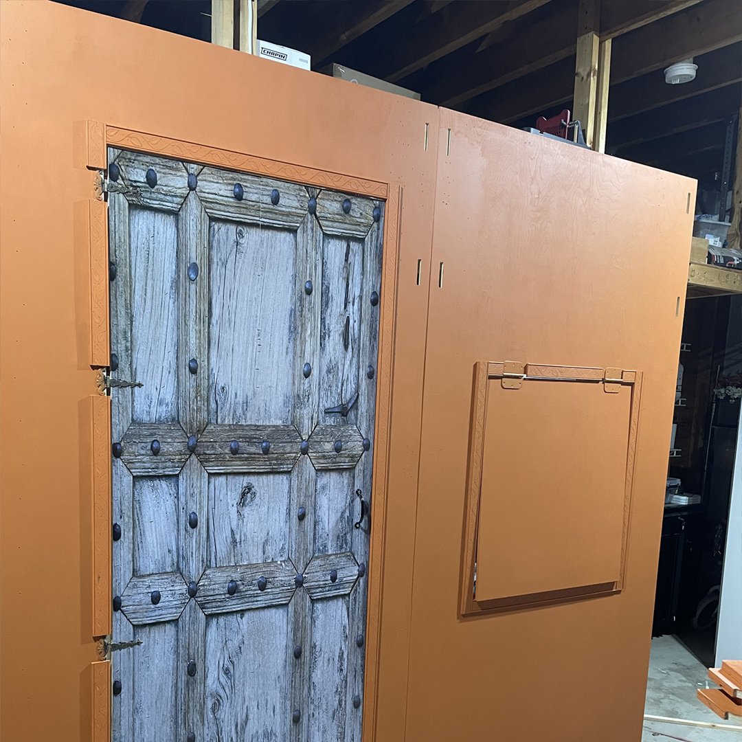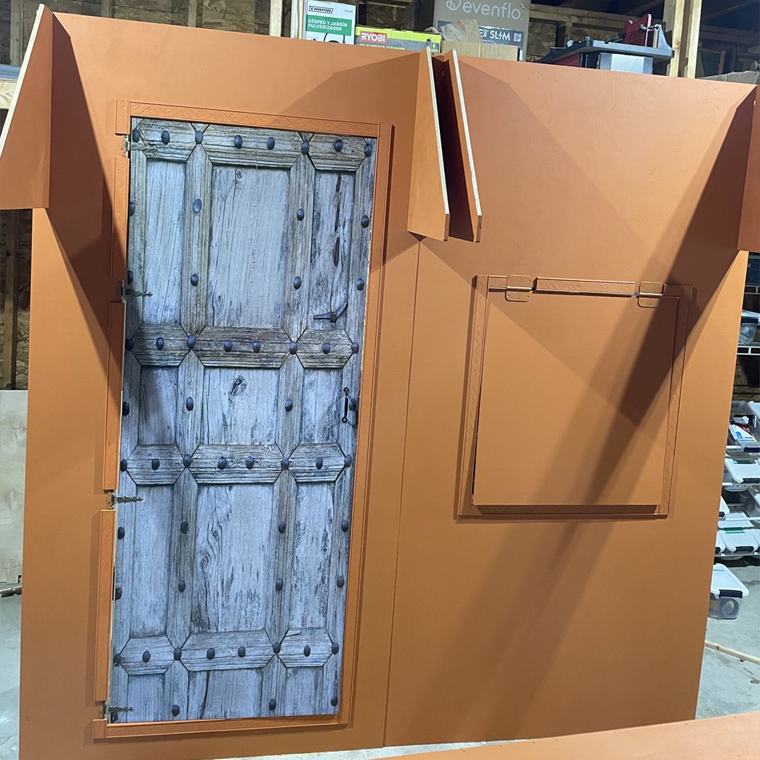 Bring charm and character to your event with our Village Entrance Backdrop, measuring 8 ft wide and designed with a small step stage for added dimension. This unique backdrop features realistic overhangs and a window opening, creating an authentic village-style look that adds depth, texture, and a welcoming feel to any celebration.